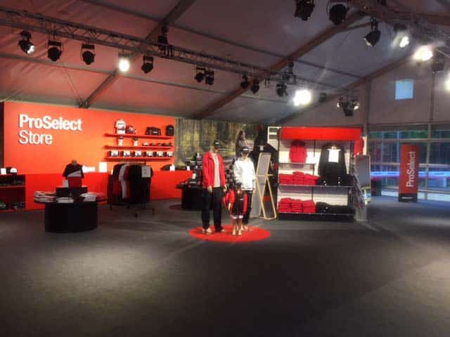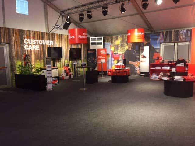 I den stora montern erbjöds det, förutom maskiner, regisserad maskinshow med pyroteknik och musik. I huvudtältet, en AluVista 15x20m levererad och byggd av Halltec visades Komatsus tjänster MaxiFleet, ProAct 2.0 och simulatorer, där fanns även en ProSelect Store, där besökarna kunde handla kläder och tillbehör. Utöver huvudtältet byggde vi även mindre tält för mötesrum, café och personal. Till tälten levererade vi även matta samt värme/AC.